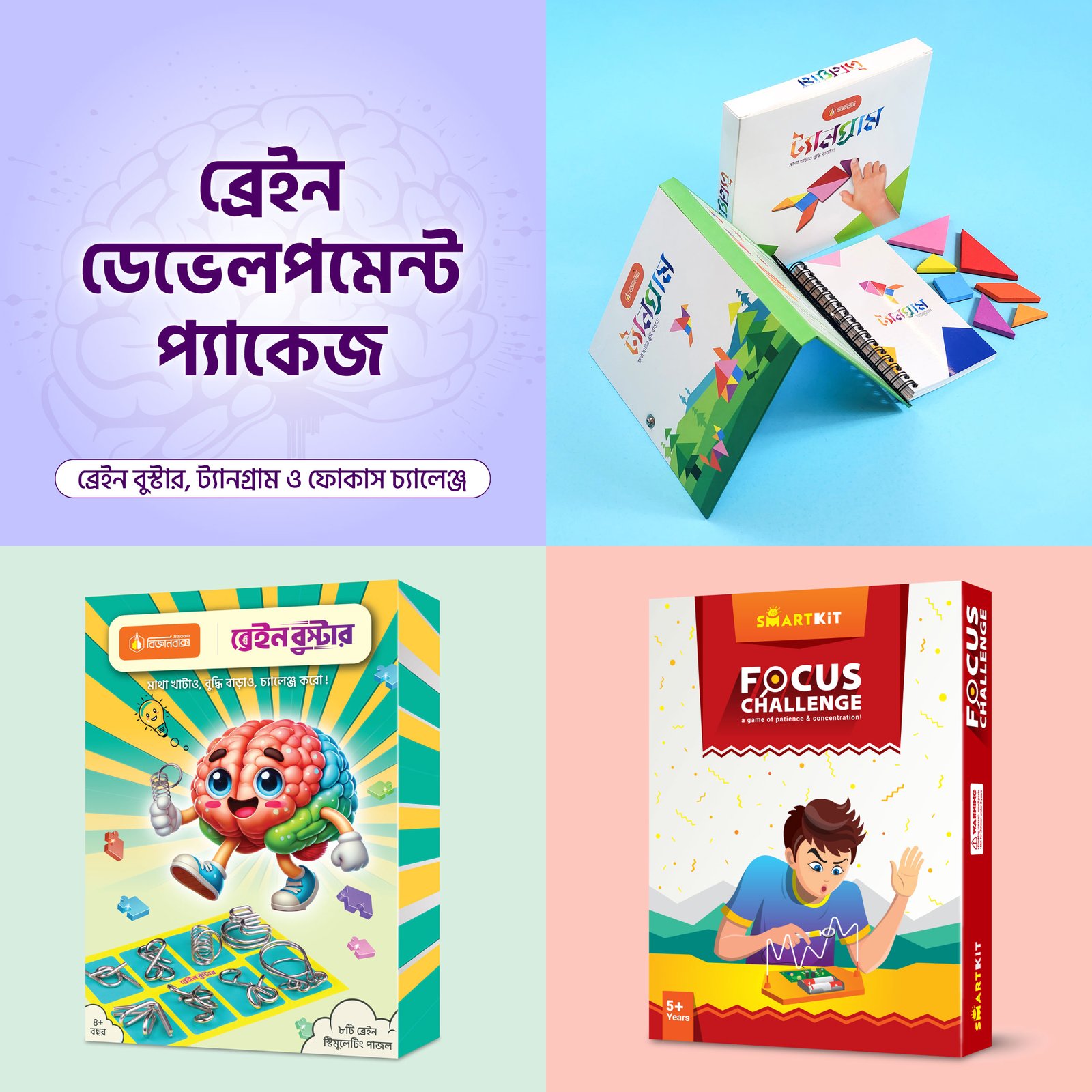 আমাদের সন্তানেরা দিনে একটা বড় সময় কাটায় ফোন, ট্যাব বা টিভির সামনে। তাদের মধ্যে বেশিরভাগই ডিজিটাল অ্যাডিকশনে আক্রান্ত। এই অ্যাডিকশনের ভয়াবহতা মারাত্মক। এতে ব্রেইনের ডেভেলপমেন্ট ক্ষতিগ্রস্ত হয় এবং ADHD এর মতো রোগে আক্রান্ত হয় তারা! এক্ষেত্রে দায়টা আমাদেরই নিতে হবে। কারণ, আমরা তো ভালো কোনো বিকল্প দিতে পারছি না তাদের! এই সমস্যার সমাধান মিলবে ব্রেইন বুস্টিং প্যাকেজে। এই প্যাকেজে তিনটা কিট আছে। যুক্তি আর বুদ্ধি প্রয়োগ করে খেলতে হবে ব্রেইন বুস্টার, মনোযোগের পরীক্ষা হবে ফোকাস চ্যালেঞ্জে আর কল্পনাশক্তি জাগিয়ে তুলবে ট্যানগ্রাম!